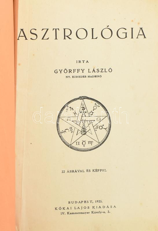 Györffy László: Asztrológia. Bp., 1935, Kókai Lajos (Buschmann F. utódai-ny.), 319+(1) p. Első kiadás. Papírkötésben, kissé foltos, sérült borítóval, részben laza fűzéssel, néhány kijáró lappal, helyenként foltos lapokkal, A szövegben aláhúzásokkal.