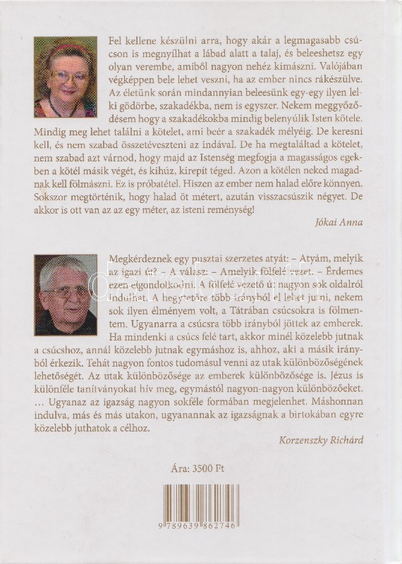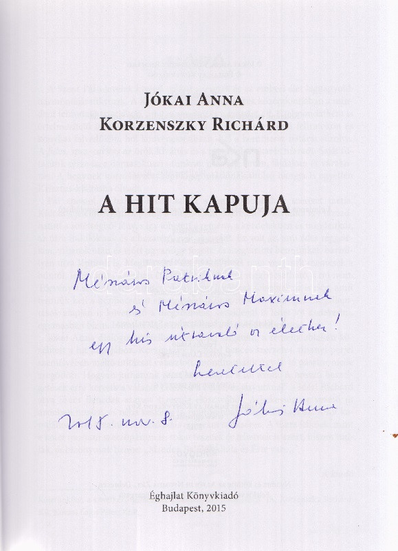 Jókai Anna - Korzenszky Richárd A hit kapuja. (Dedikált.) Budapest, 2015. Éghajlat Könyvkiadó (Alföldi Nyomda Zrt.) 1 t. (színes, kétoldalas címképen a szerzők portréja) + 150 + [2] p. Első kiadás. Dedikált: ,,Mészáros Patriknak és Mészáros Maximnak egy kis útravaló az élethez! Szeretettel Jókai Anna. 2015. nov. 9." Jókai Anna író, költő és Korzenszky Richárd bencés szerzetes, tihanyi perjel katolikus szellemiségű beszélgető könyve hitről, életelvekről, irodalomról, művészetről, egyházról és érintőlegesen a félmúlt politikájáról. (Manréza-füzetek, 13. kötet.) Aranyozott, színes, illusztrált kiadói kartonkötésben. Jó példány.