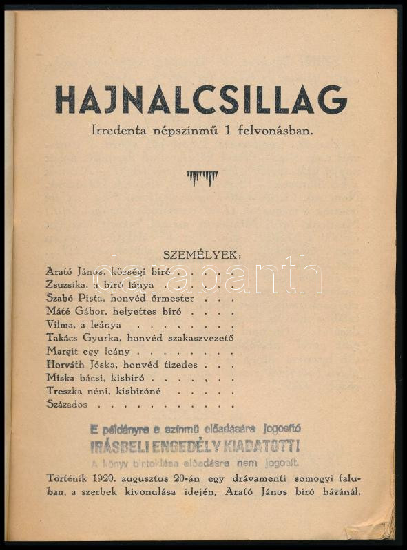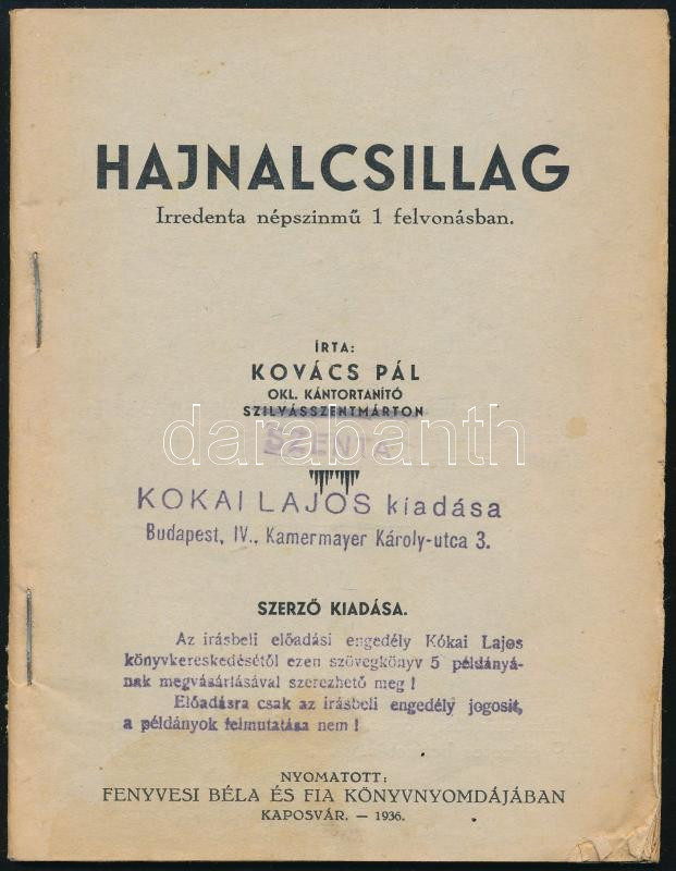Kovács Pál: Hajnalcsillag. Irredenta népszínmű 1 felvonásban. H.n., 1936, szerzői kiadás (Kaposvár, Fenyvesi Béla és Fia-ny.), 30 p. Kiadói tűzött papírkötés, a borító és néhány lap szélén kis sérüléssel. (Ritka!)