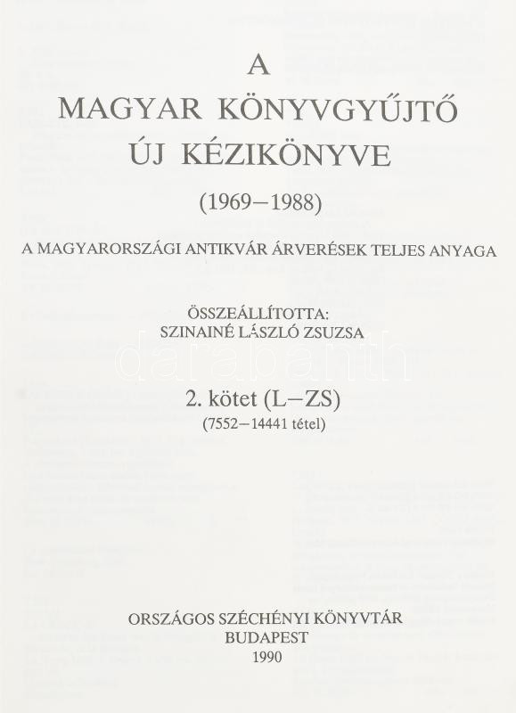 Szinainé László Zsuzsa: A Magyar Könyvgyűjtők új kézikönyve I-II (1969-1988) A magyarországi antikvár árverések teljes anyaga, Bp 1990, OSZK 1850p. Két kötetben, Sérült kiadói vászonkötésben