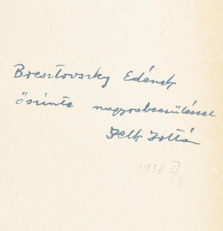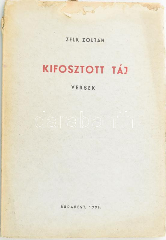 Zelk Zoltán: Kifosztott táj. Versek. (DEDIKÁLT). Bp., 1936, szerzői kiadás (Dr. Antos és Társa-ny.), 68+(4) p. Első kiadás. Kiadói papírkötés, sérült borítóval, kisebb lapszéli penészfoltokkal. A szerző, Zelk Zoltán (1906-1981) költő által Bresztovszky Ede (1889-1963) író, újságíró, műfordító részére DEDIKÁLT példány.