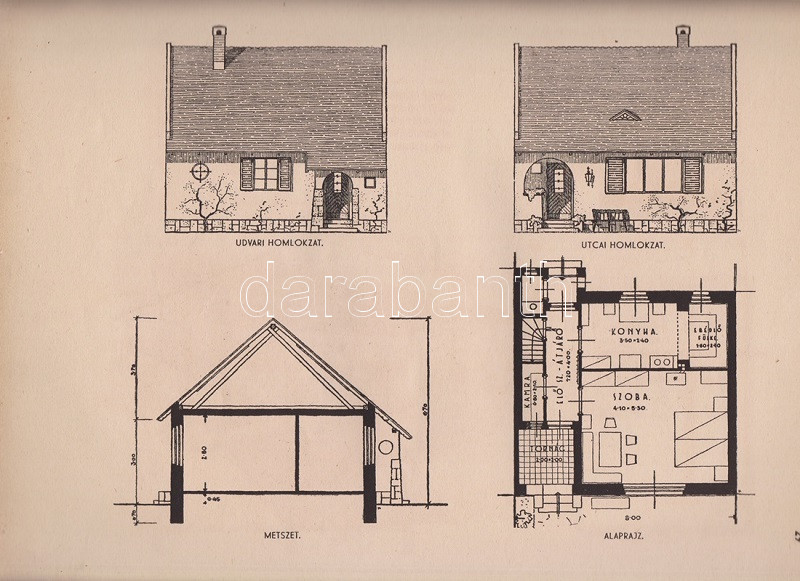 Kislakásos családi házak mintatervei. Sajtó alá rendezte Bierbauer Virgil. (Budapest, 1941): Fővárosi Közmunkák Tanácsa (Stephaneum ny.) 128 p. Az egyéni házépítések visszásságait tapasztalva a Fővárosi Közmunkák Tanácsa tervpályázatot hirdetett kislakásos családi házak típusainak kidolgozására. Kiadványunk a neves építészek által beküldött díjnyertes pályázatok anyagából szemezget. Kislakásos családi házak gyanánt 100 négyzetméter alapterületnél kisebb méretű, földszintes, sátortetős családi házakat terveztek a mérnökök, a sorházak, a félig szabadon álló és a szabadon álló családi házak kategóriáiban. Oldalszámozáson belül egész oldalas ábrákkal, homlokzati és alaprajzokkal, illetve helyszíni térképvázlatokkal gazdagon illusztrálva. A 115. oldaltól a pinceépítést, az alapozást, a födémszerkesztést, a nyílászáró-építést bemutató szerkezeti részletrajzok. Emlékezetes dokumentum a Kádár-kockák eluralkodása előtti kertvárosi és falusi építészetről, amely még fontosnak tartotta a konyhakert és a tornác koncepcióját, illetve a népi építészet néhány hagyományának megőrzését. Néhány oldalon enyhe foltosság, példányunk fűzése meglazult. Fűzve, sérült, javított gerincű kiadói borítóban, az első fedőborítón apró foltosság.