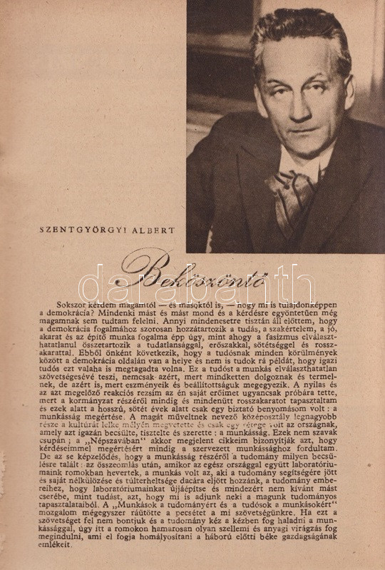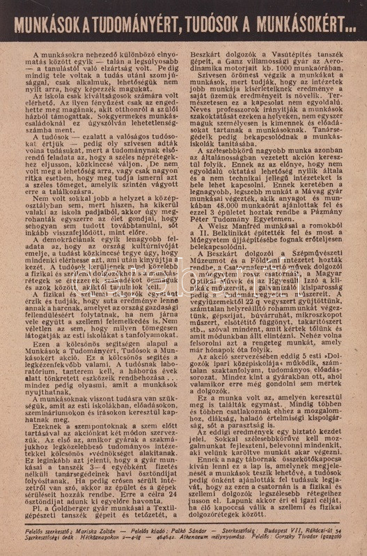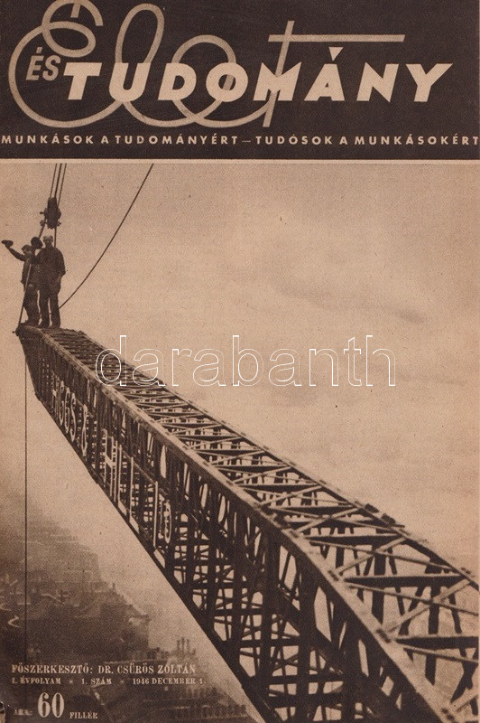 Élet és Tudomány. Munkások a tudományért - Tudósok a munkásokért. Felelős szerkesztő: Mariska Zoltán. I. évfolyam, 1-2. szám, II. évfolyam, 1-12 szám. (1946-1947) [Egybekötve.] Budapest, 1946-1947. Athenaeum ny. 32 p.; 32 p.; 384 p. Kéthetente megjelenő tudományos ismeretterjesztő folyóirat. A lapot 1946-ban Szent-Györgyi Albert alapította, első felelős szerkesztője Csűrös Zoltán vegyészmérnök volt. Első száma 1946. december 1-jén jelent meg, melyhez a Nobel-díjas lapalapító maga írta a bevezető cikket. A folyóirat rendkívül gazdag képanyaggal, közérhető nyelven írt természettudományos kérdésekről - a fizika, a kémia, a biológia (és az orvostudomány), a természetföldrajz (és a földtudományok), a csillagászat és a műszaki tudományok kérdéseiről, számos tudománytörténeti cikk kíséretében. A hátsó borítóról fokozatosan eltűnnek a nyomást végző Athenaeum kiadó könyvajánlói, helyükön a Szovjetunió-beli találmányokat és a szovjet újjáépítést ünneplő fotóanyag tűnik föl. Kiadói félvászon kötésben, az első kötéstáblán aranyozott címfelirattal. Jó példány.
