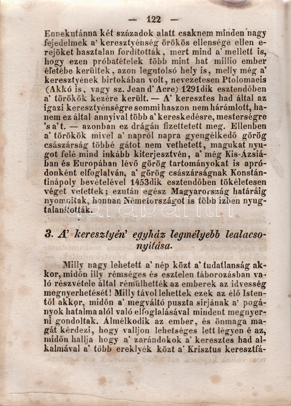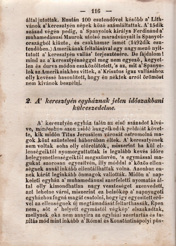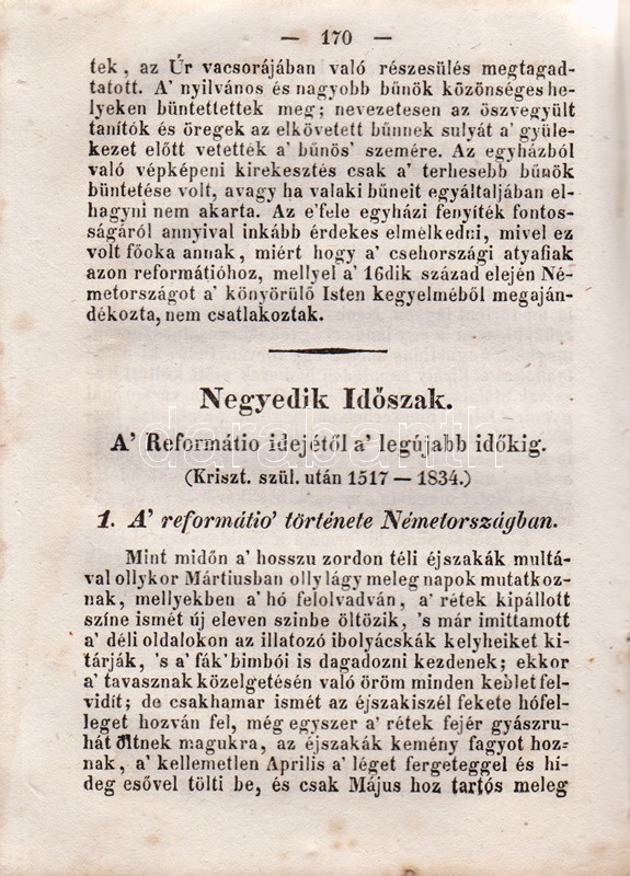 Protestáns szemléletű egyháztörténeti munka az első őskeresztény gyülekezetek kialakulásától 1834-ig, fókuszában a katolikus egyház és a protestáns felekezetek konfliktusával. A lutheri időktől kezdve a munka főként a német és francia vallási konfliktusokat tekinti át, érthető módon markánsan protestáns nézőpontból. Oldalszámozáson belül gazdag szövegközti képanyaggal. Az oldalakon apró foltosság. A repülő előzékek hiányoznak, az első előzéken régi tulajdonosi bejegyzés.