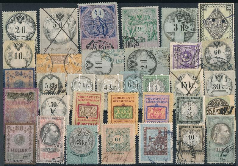 Leírás: 34 db régi magyar, osztrák és egyéb külföldi okmánybélyeg