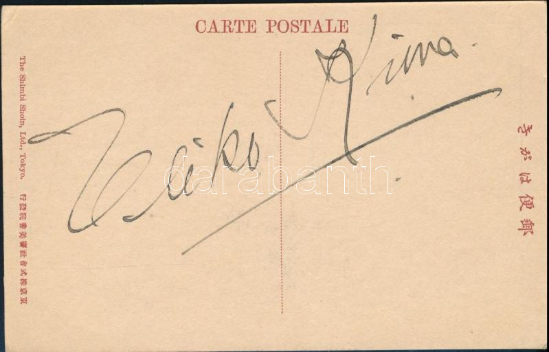 cca 1930 Teiko Kiwa, szül. Laetitia Jacoba Wilhelmina Klingen (1902-1983) japán-holland opera-énekesnő autográf aláírása japán képeslapon, 14x9 cm / Autograph signature of Teiko Kiwa, born Laetitia Jacoba Wilhelmina Klingen, Japanese-Dutch opera singer, on a Japanese postcard