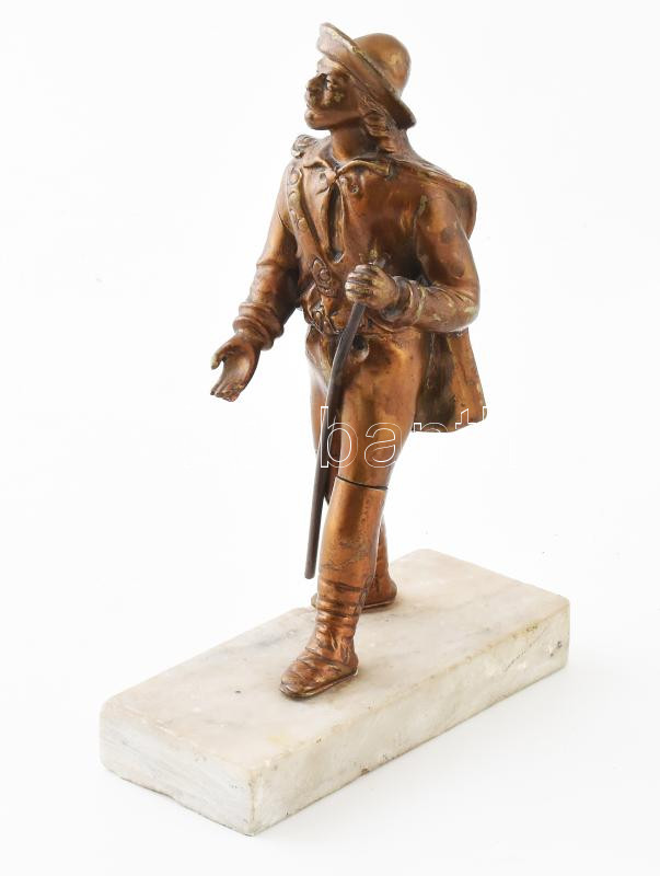 Leírás: Sétáló férfi. Bronzírozott fém szobor, márvány talpazaton, kopással, m: 20,5 cm