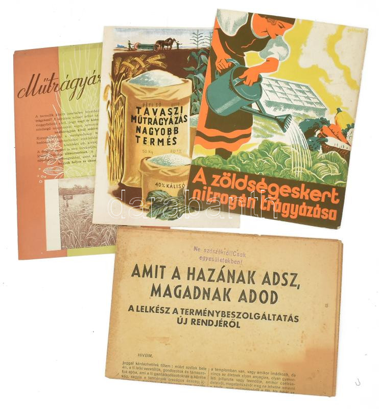 cca 1930-1955 3 db mezőgazdasági témájú reklámlap és prospektus + Amit a hazának adsz, magadnak adod - A lelkész a terménybeszolgáltatás új rendjéről, kissé foltos, 7 p.