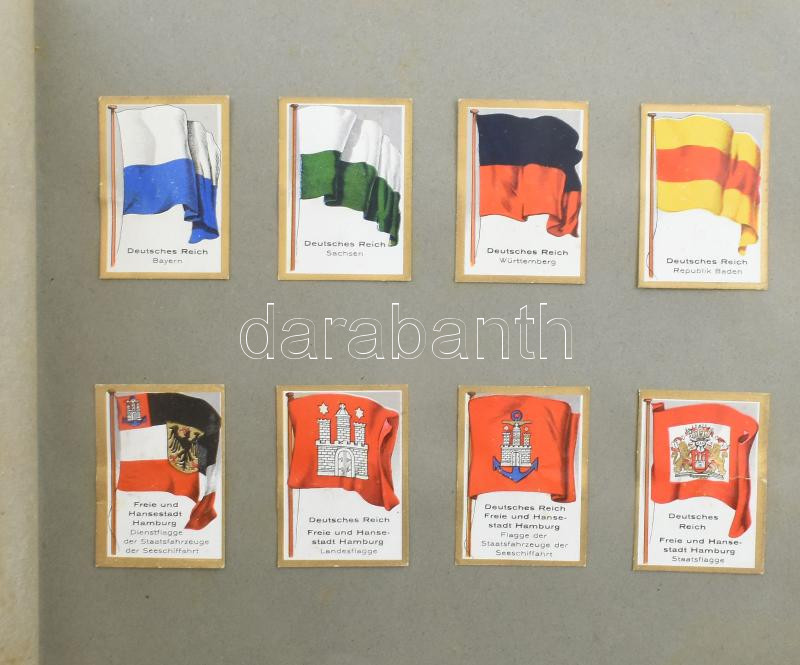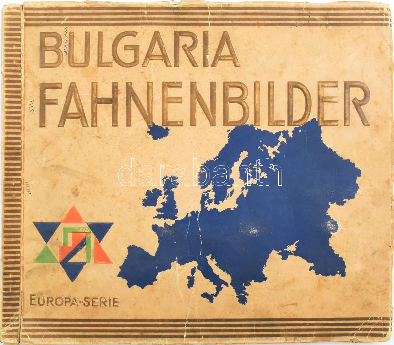 Leírás: cca 1930 Bulgaria-Fahnenbilder. Europa-Serie. Die Flaggen Europas. Cigarettakép gyűjtő album,2+27 p.+8 t. Kiadói papírkötés, szakadt, foltos borítóval, hiányos (kb. 20 kép.)