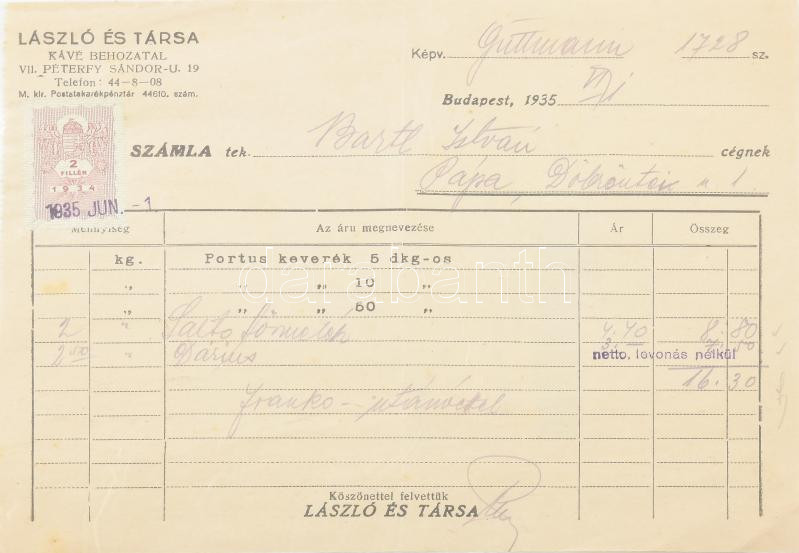 1935 László és Társa Kávé Behozatal, Bp. VII. Péterfy Sándor u. 19., f... https://www.darabanth.com/hu/463-Gyorsarveres/463.0/Mutargy-papirregiseg-egyeb/Okmanyok~1000023/1935-Laszlo-es-Tarsa-Kave-Behozatal-Bp-VII-Peterfy-Sandor-u-19-fejleces-szamla-Portus~II3114818