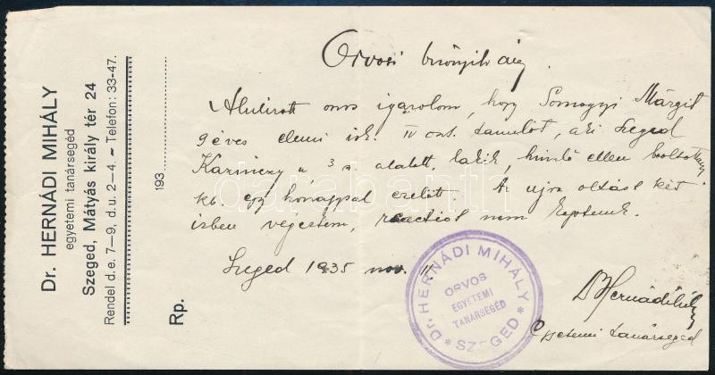 Leírás: 1935 Orvosi bizonyítvány dr. Hernádi Mihály Szegedi orvos írásával, vényen