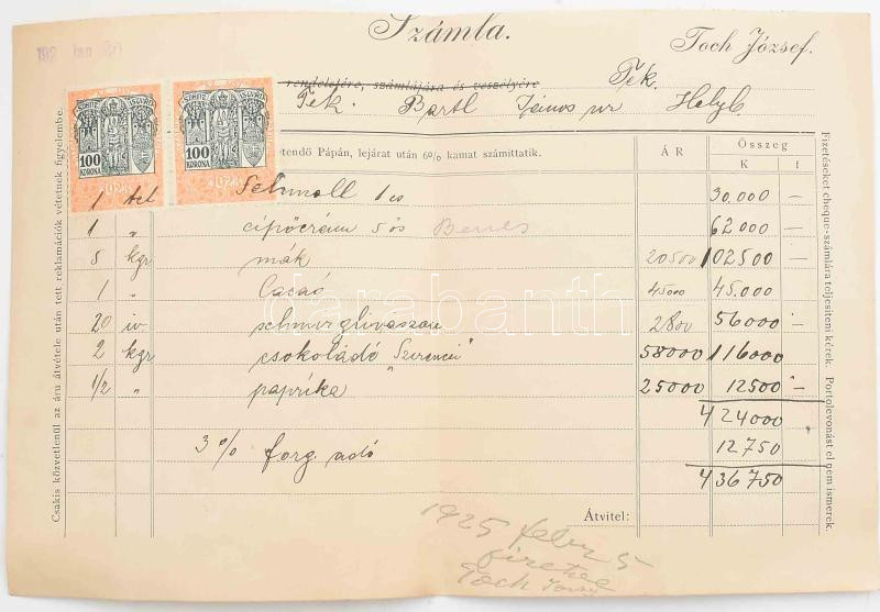 Leírás: 1925 Toch József fejléces számla Szerencsi csokoládé, kakaó, mák, paprika tárgyában
