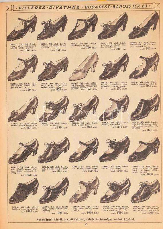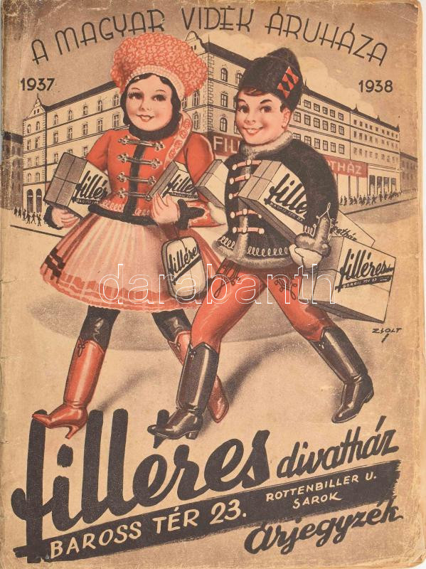 1937 A magyar vidék áruháza 1937-1938. Filléres Divatház árjegyzék. Rendkívül gazdag képanyaggal illusztrált. Illusztrált papírkötés, kopott borítóval, az elülső borítón kis szakadások, a hátsó borító szakadt, javított, az utolsó 1-2 lap szélein kis szakadások, 98 p.