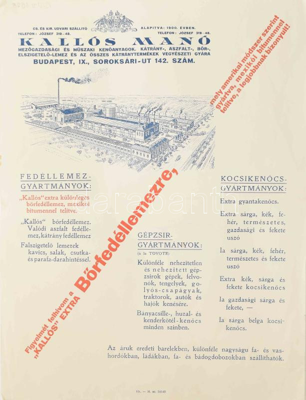 cca 1910 Kallós Manó mezőgazdasági és műszaki kenőanyagok, kátrány-, aszfalt, bőr-, elszigetelő-lemez és az összes kátránytermékek vegyészeti gyára, hajtott, 31x23 cm.