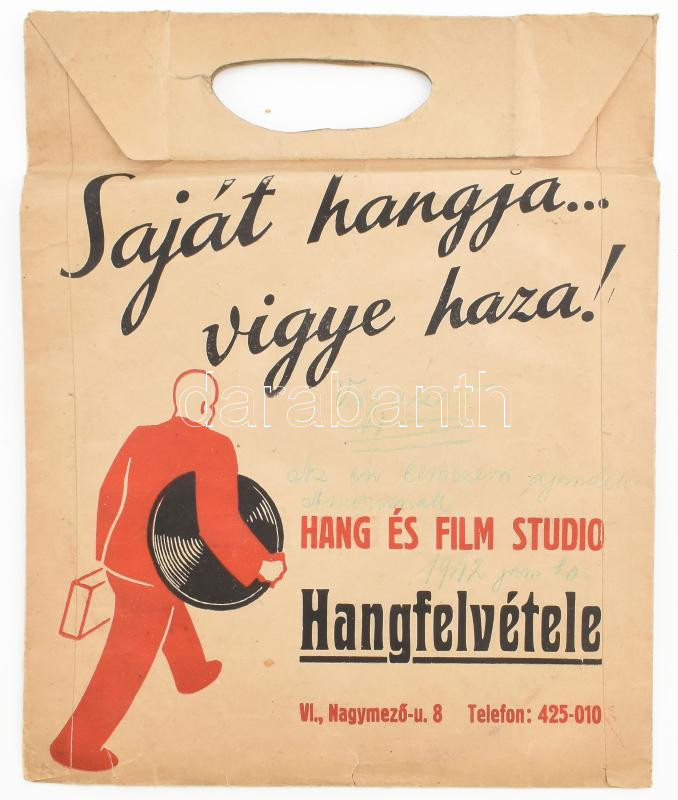 cca 1930-1940 Hang és Film Studio Hangfelvétele papírtasak. https://www.darabanth.com/hu/463-Gyorsarveres/463.0/Mutargy-papirregiseg-egyeb/Reklam~2000003/cca-1930-1940-Hang-es-Film-Studio-Hangfelvetele-papirtasak~II3118935