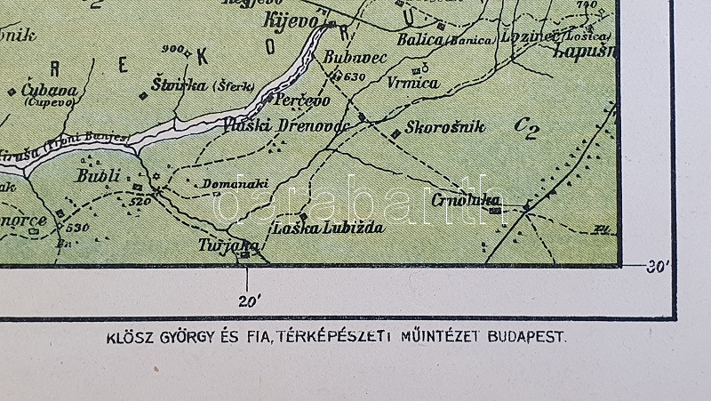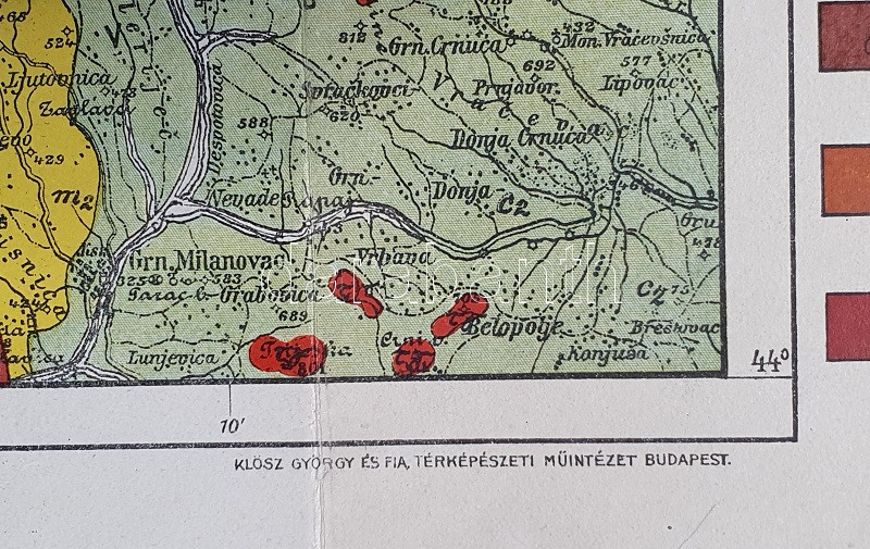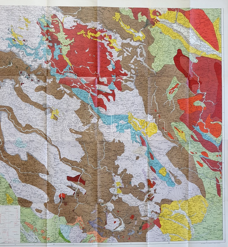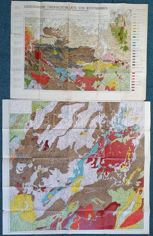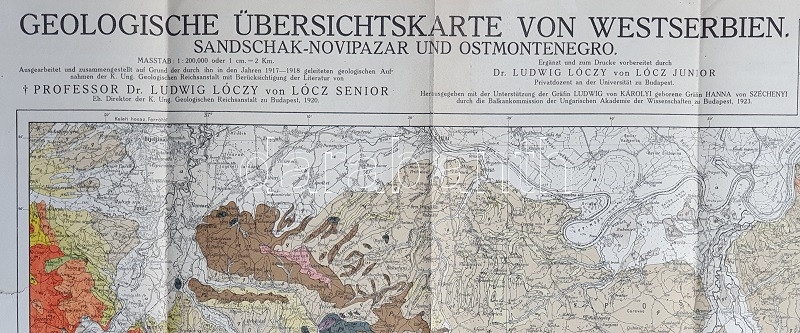 Geologische Übersichtkarte von Westserbien, Sandschak-Novipazar und Ostmontenegro. Masstab: 1 : 200,000. (1923). Idősebb és ifjabb Lóczy Lajos színes geológiai térképe Nyugat-Szerbiáról, valamint a Szandzsákról és Kelet-Montenegrótól. Mérték: 1 : 200,000 [Két térképszelvény, teljes]. Budapest, 1923. Klösz György és Fia Térképészeti Műintézete. Két színes kőnyomat, méretük: 487x640 mm egy 580x825 mm méretű térképlapon (Nyugat-Szerbia), illetve 823x800 mm egy 900x830 méretű térképlapon (Szandzsák és Kelet-Montenegró). Az első világháború idején, a Magyar Tudományos Akadémia és a Földtani Intézet megbízásából, Károlyi Lajosné Széchenyi Hanna támogatásával egy népesebb kutatócsapat indult a délszláv régió közép-balkáni vidékének geológiai felmérésére. Az 1918-1919-ben lezajlott expedíció a Belgrádtól délnyugatra elhelyezkedő, nagyjából 150x100 km kiterjedésű térség földtani térképezését célozta, a térképszelvények északi határát keletről nyugatra a Belgrád-Szabács-Bijeljina vonal jelenti (ez utóbbi város már a Drina folyón is túl, nyugaton, bosnyák területen áll), déli határát keletről nyugatra az Ipek-Spuž-Nikšič városok jelentette vonal jelenti (a koszovói területen fekvő Ipek mai neve Peja, a másik két település már montenegrói területen fekszik, nevük változatlan). A két színes térképszelvény a földrajzi szélesség 44. foka mentén csatlakozik egymáshoz. Az északi térkép nyugati szélén a Drina kanyarog, a folyó osztja a területet szerb, illetve szerb és bosnyák kevert lakosság által lakott területre, a déli rész pedig az eredendően is igen kevert etnikumú Szandzsák területét ábrázolja, amely az expedíció idején visszafoglaló harcok helyszíne, a térkép készülte idején a friss államalakulat, a Szerb-Horvát-Szlovén Királyság felségterülete volt, ma pedig a területen Montenegró északkeleti, Albánia északi, Koszovó északnyugati és Szerbia délnyugati régiói osztoznak, kultúráját illetően pedig mindig is keveredtek a szerb, az albán, a montenegrói és a török hagyományok. Térképünk ugyanakkor nem a felszín etnikai leírását célozza, hanem a jelentős méretű terület geológiai felmérését. A német nyelvű kőzetréteg-jelszínkódolás az északi térképszelvény jobb szélén kapott helyet, a térkép készítéséhez felhasznált, 1886-1922 közötti forrásmunkák felsorolása pedig ugyanezen térképszelvény bal szélén foglal helyet., a térképeken a geológiai színkódoláson kívül a térség vízrajzi, domborzati, közút- és vasúthálózata, valamint településrendszere kapott helyet. Az északi térképszelvény bal oldalán kisebb, a térképfelületet nem érintő szakadásnyom. Jó állapotú térképlapok, hajtogatva.