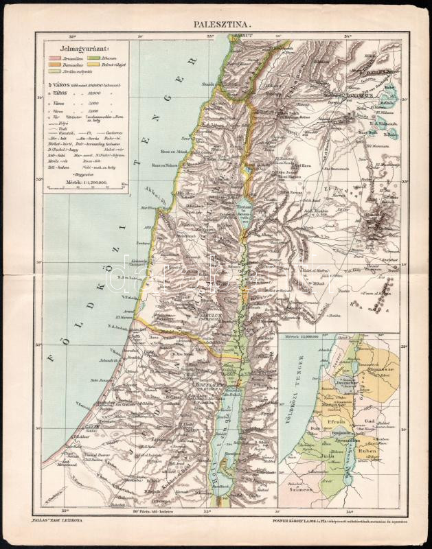 Leírás: cca 1930 Palesztina térképe, Pallas Nagy Lexikona, kiadja: Posner Károly Lajos és Fia, 30×24 cm
