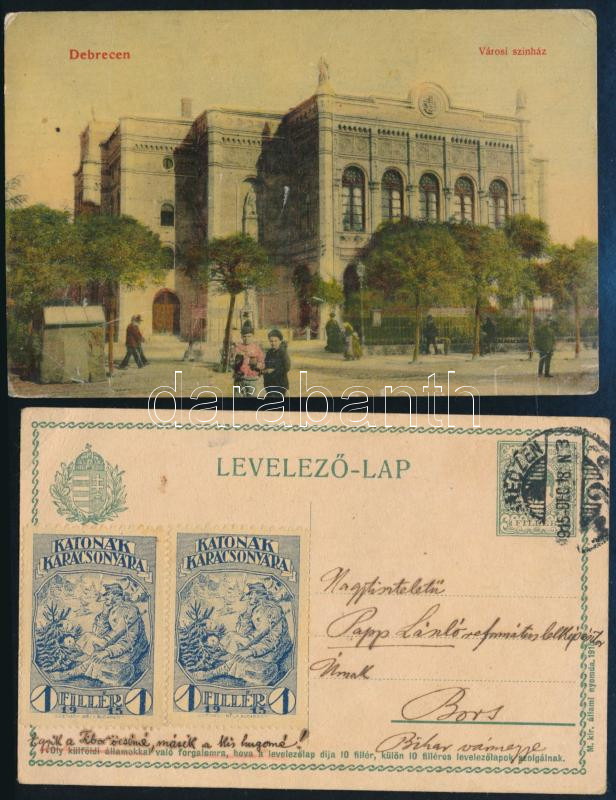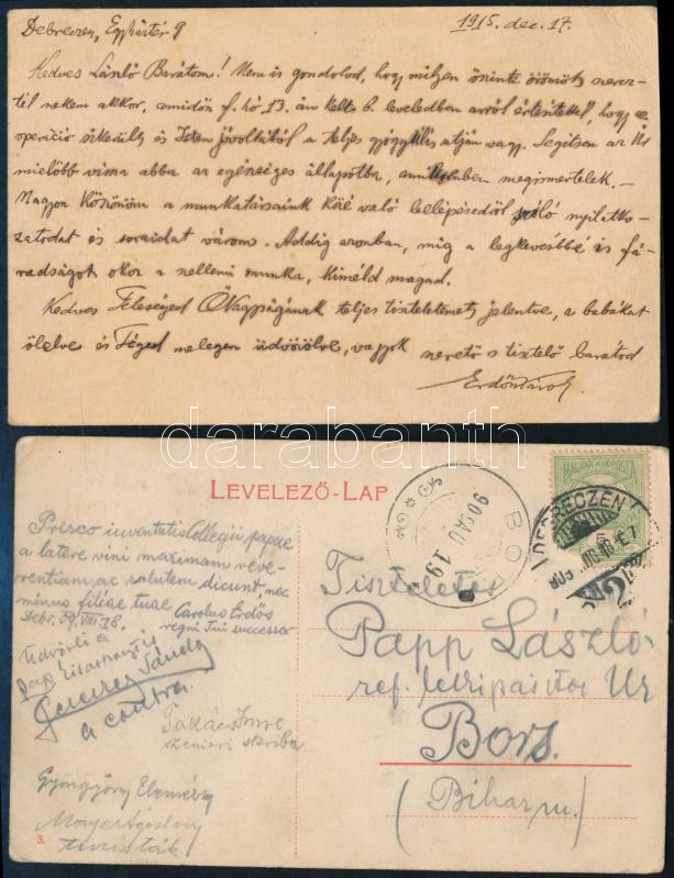 1909-1915 Erdős Károly (1887-1971) későbbi ref. (debreceni) teológiatanár autográf képeslapjai, az egyik hátoldalán a Deb. városi színházzal, egyik latin nyelven és további autográf aláírásokkal Papp László ref. lelkipásztornak Borsra (Bihar m.) küldve