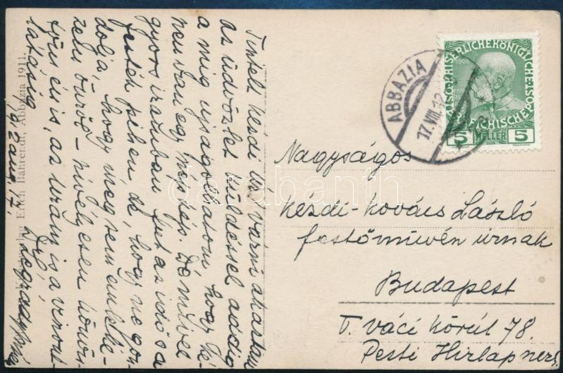 1912 Abbazia, Légrády Imréné, Légrády Imre (1868-1932) felesége által Kézdi-Kovács László (1864-1942) festőművész, műkritikus, a Pesti Hírlap műkritikusa részére szóló képeslap.