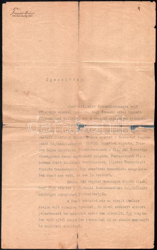 1921 Igazolvány, amelyben Steuer György államtitkár Torontál vármegye volt főispánja igazolja, hogy Trasser Anal orvostanhallgató az 1919. évi kommün ideje alatt semminemű kommunista mozgalomban nem vett részt, mert Temesvárról szüleihez Sárfalvára szökött, így javasolja, hogy folytathassa az orvosi karon a tanulmányait, szakadozott, javításokkal