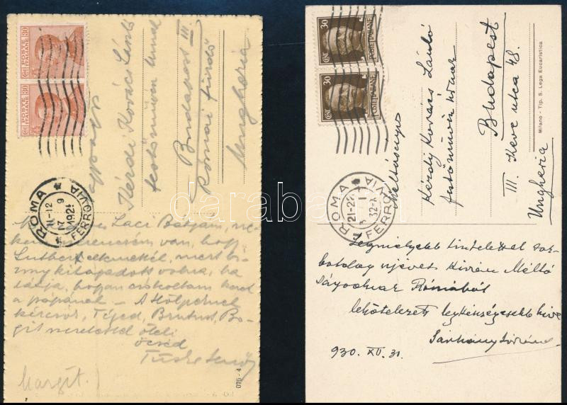 Leírás: 1929-1932 Tüske Jenő (?-?) és Sárkány Lóránd (1904 - 1973) festőművészek képeslapjai (1-1 db), Rómából haza, Kézdi-Kovács László (1864-1942) festőművész, műkritikus részére.