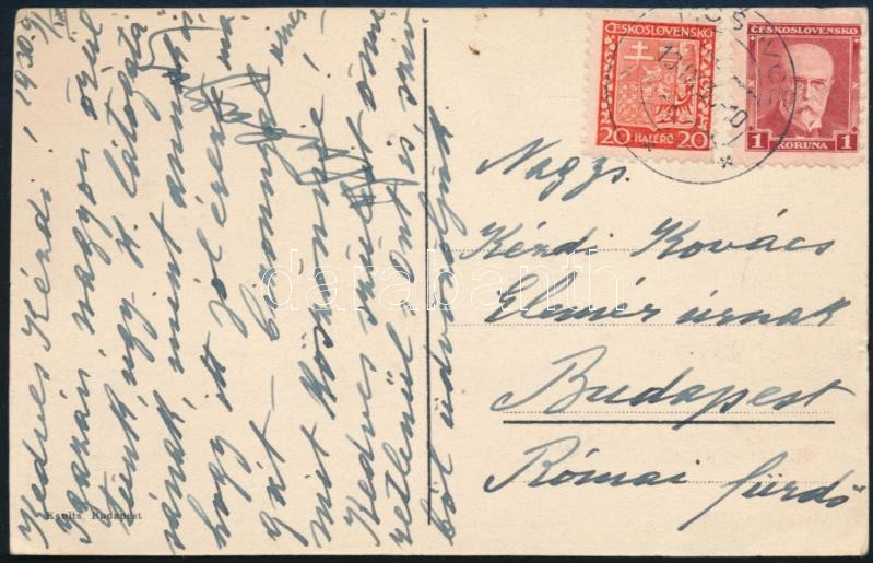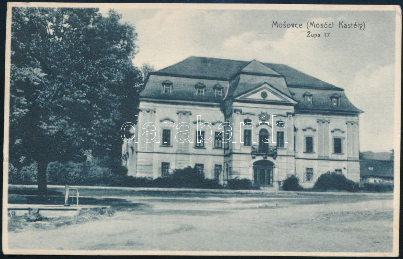 1930 Ismeretlen személy által Kézdi-Kovács Elemér (1898-1976) festőművész részére írt sorok kék tónusú képeslapon, a hátoldalán a mosóci (Mosovce) kastéllyal.