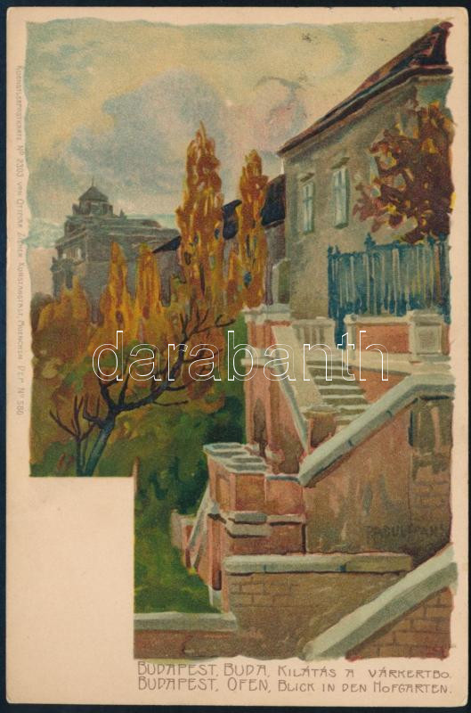 1935 Kézdi-Kovács László (1864-1942) festőművész, műkritikus és családja részére szóló képeslap, rajta art deco stílusú festmény képével: "Kilátás a várkertbazárból."