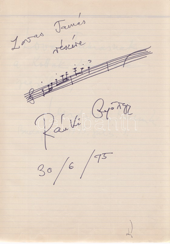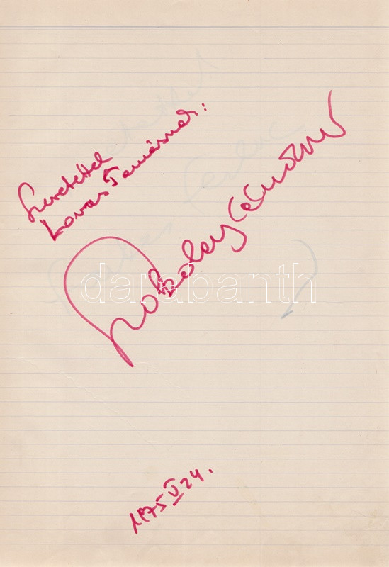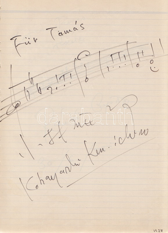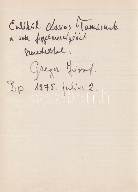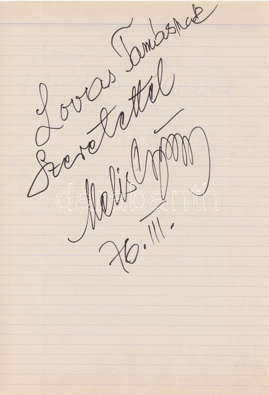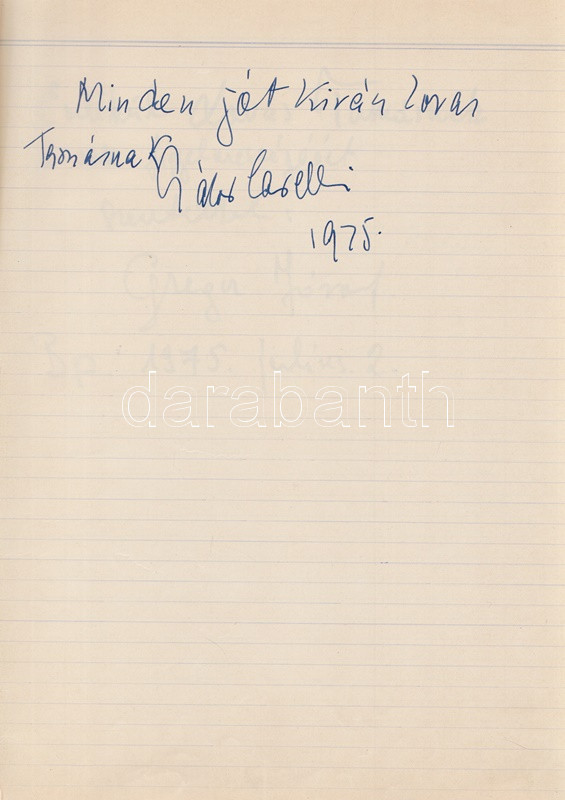 Művészek Vendég-könyve - Kobajasi Kenicsiró, Fischer Ádám karmesterek, Fényes Szabolcs, Petrovics Emil, Ránki György, Szokolay Sándor zeneszerzők és a magyar komolyzenei élet számos kiválóságának dedikálásával. 19 dedikációból, illetve négy aláírásból álló gyűjteményünk Lovas Tamás kottatáros munkája, a Magyar Állami Operaház munkatársa 1975 és 1976 között gyűjtötte gazdag kollekcióját. A dedikálók és aláírók listája: * Karmesterek, zeneszerzők: Kobajasi Kenicsiró japán karmester; Daniel Barenboim argentin-izraeli karmester (aláírás); Erdélyi Miklós karmester; Farkas Ferenc zeneszerző; Fényes Szabolcs zeneszerző, operettszerző; Fischer Ádám karmester; Kósa György zeneszerző; Lendvay Kamilló zeneszerző; Petrovics Emil zeneszerző; Ránki György zeneszerző (kottarajzzal); Szokolay Sándor zeneszerző, karmester. * Zenész: Perényi Miklós gordonkaművész, zeneakadémiai tanár. * Operaénekesek és -énekesnők: Carelli Gábor (tenor); Csengery Adrienne (szoprán); Gregor József (basszus); Melis György (bariton); Palcsó Sándor (tenor); Radnai György (bariton); Simándy János (tenor). * Énekesek: Katona Klári énekesnő; Sebestyén Márta népdalénekesnő (kottarajzos aláírás). * Színművészek: Huszti Péter és Piros Ildikó színművészek (aláírás). *** A gyűjtemény végén a gyűjtő négy oldalnyi jegyzete. Kézzel feliratozott, félvászon füzetben. Jó példány.