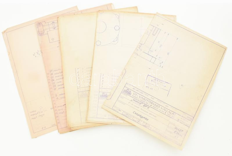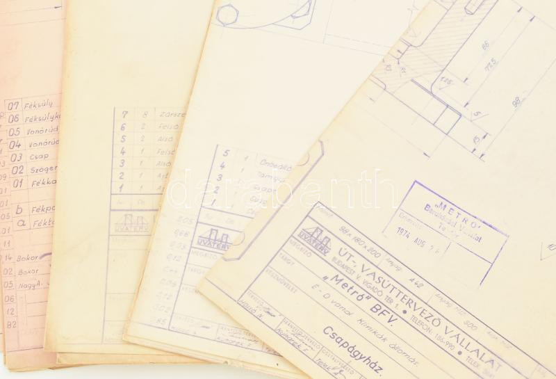 cca 1974-77 Budapest, É-D-i metró (M3) épÃtési sokszorosÃtott tervrajzai a Klinikák megállónál, , csapágyházról, gépszállÃtó folyosó ajtóról, végtárcsáról stb., össz. 6 db, részben Uvaterv felirattal és Metró Beruházási Vállalat bélyegzÅ‘ivel. Karton mappában.