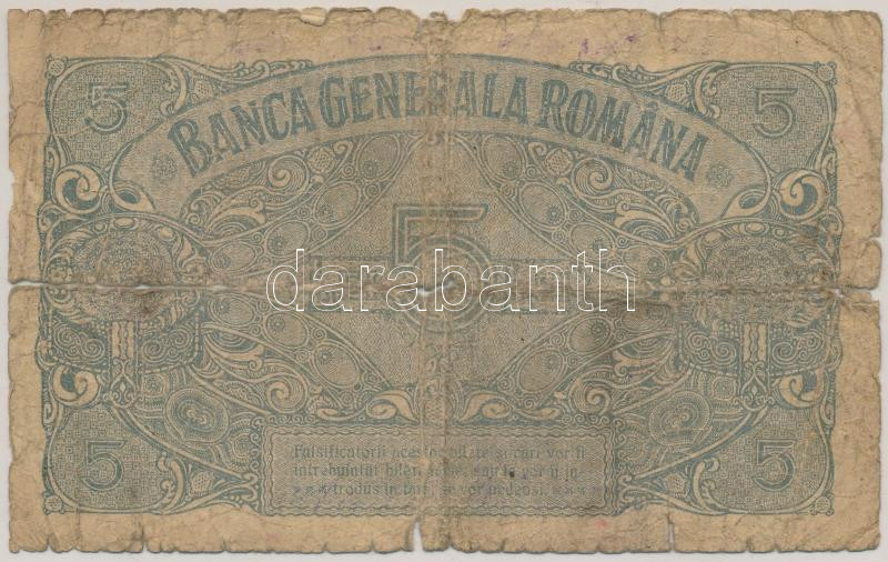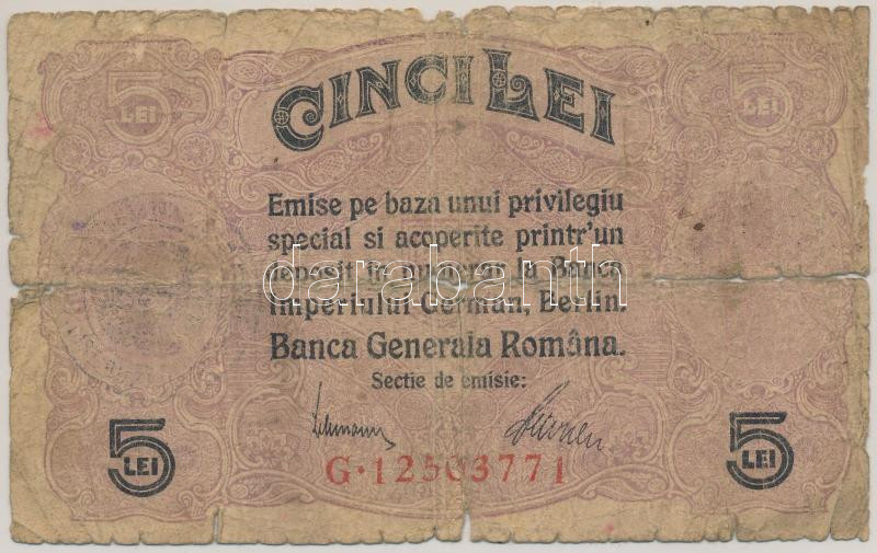 Romania / German Occupation 1917. 5 Lei "G 12503771" C:G tear, material error