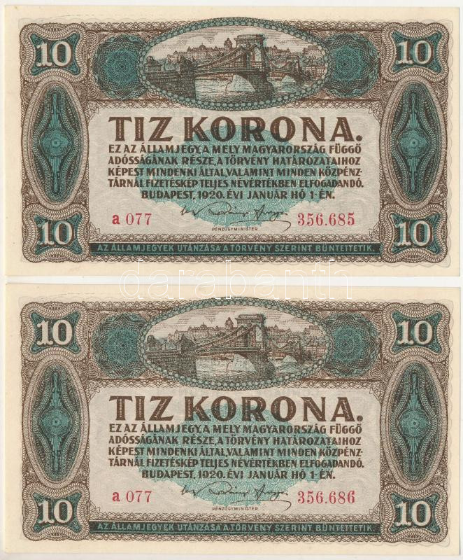 Ad... https://www.darabanth.com/hu/463-Gyorsarveres/463.0/Numizmatika/Magyar-bankjegyek~500007/1920-10K-2x-sorszamkovetok-a-077-356685-a-077-356686-T-AUAdamo-K14~II3114782