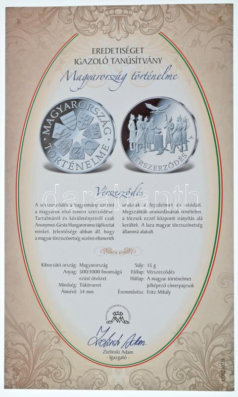 Leírás: Fritz Mihály (1947- ) DN "Vérszerződés / Magyarország Történelme" Ag emlékérem tanúsítvánnyal (15g/0.500/34mm) T:PP