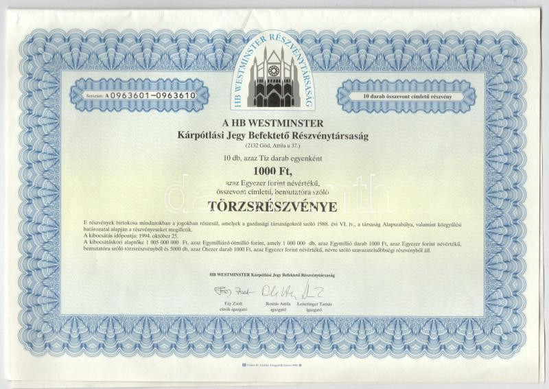 Leírás: Göd 1995. "HB Westminster Kárpótlási Jegy Befektető Részvénytársaság" 10db részvénye egyenként 1000Ft-ról, szelvényekkel (6x) sorszámkövetők T:AU