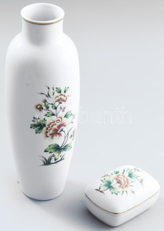 Leírás: Hollóházi virágmintás váza és bonbonier. Jelzett, kis kopással.
