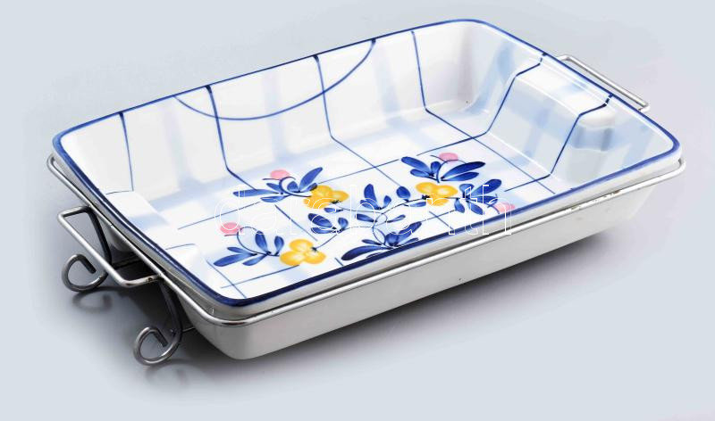 Leírás: Porcelán sütőedény fém tartóval, hibátlan, 36x24 cm
