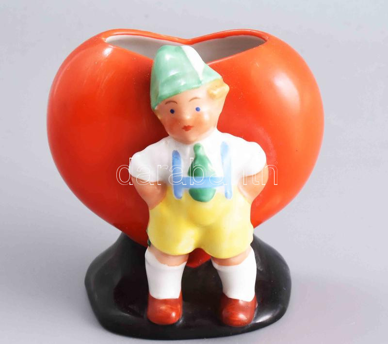 Leírás: Virágváza szív alakú, kisfiú. Mázas porcelán, jelzett, hibátlan 8 cm