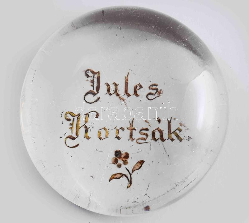 Üveg levélnehezék, Jules Kortsák felirattal, cca 19. sz vége, kis kopá... https://www.darabanth.com/hu/463-Gyorsarveres/463.0/Porcelan-keramia-uveg/Uvegtargyak~1000010/Uveg-levelnehezek-Jules-Kortsak-felirattal-cca-19-sz-vege-kis-kopassal-d-9-cm~II3117912
