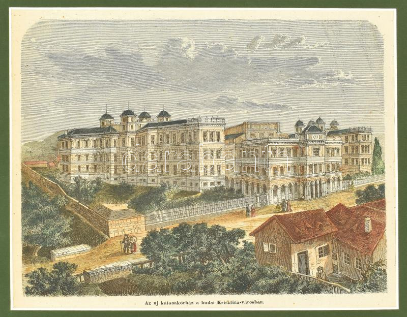 cca 1872 A budai katonakórház a Krisztina-városban [1945-ben megsemmisült], színezett fametszet, papír, In: Vasárnapi Ujság 1872. augusztus 18., paszpartuban, 19x24 cm, paszpartu: 29x34 cm