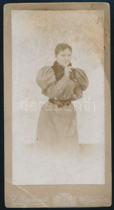 Leírás: cca 1910 Női portré, keményhátú fotó J. Dajkovits verseci műterméből, kopásnyomokkal, sarkán törésnyom, 20,5×10,5 cm