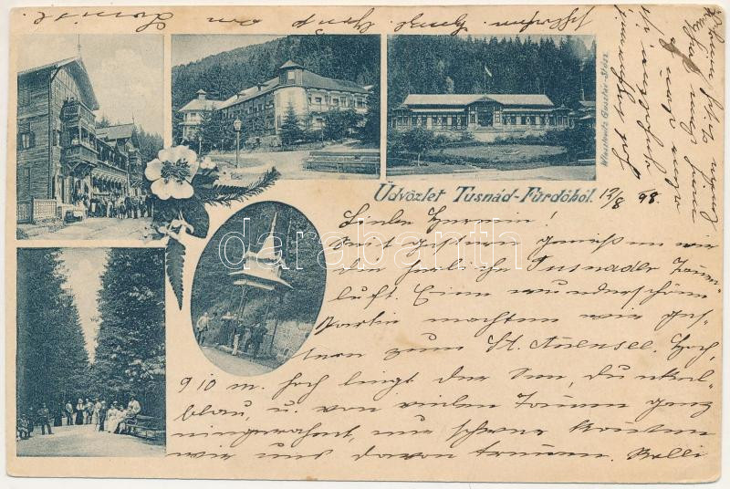 Leírás: 1898 (Vorläufer) Tusnádfürdő, Baile Tusnad; fürdők, szálloda, kút. Wlaszlovits Gusztáv kiadása / spa, hotel, well. Art Nouveau, floral (Rb)