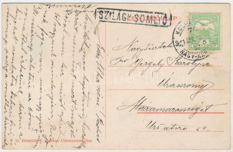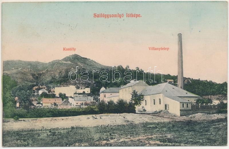 1911 Szilágysomlyó, Simleu Silvaniei; látkép, Simai kastély, villanytelep. Heimlich K. kiadása / general view, castle, electric power plant, power station + "KOLOZSVÁR - NAGY-KÁROLY 74. SZ." vasúti mozgóposta bélyegző (fl)