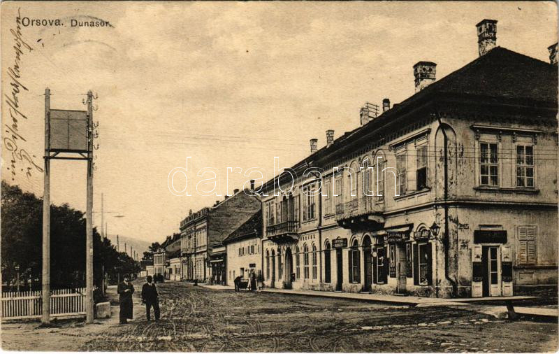 Leírás: 1915 Orsova, Dunasor, Weber János üzlete, zálogház, könyvnyomda. Hutterer G. kiadása / shops, street view