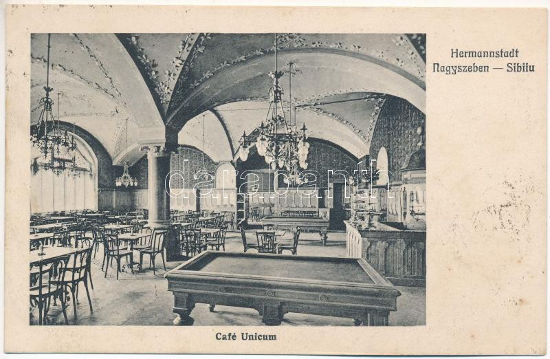 1921 Nagyszeben, Hermannstadt, Sibiu; Café Unicum kávéház, belső biliá... https://www.darabanth.com/hu/464-Gyorsarveres/464.0/Kepeslapok/Erdely~2000006/1921-Nagyszeben-Hermannstadt-Sibiu-Cafe-Unicum-kavehaz-belso-biliardasztalokkal-Jos-Drotleff~II3079111
