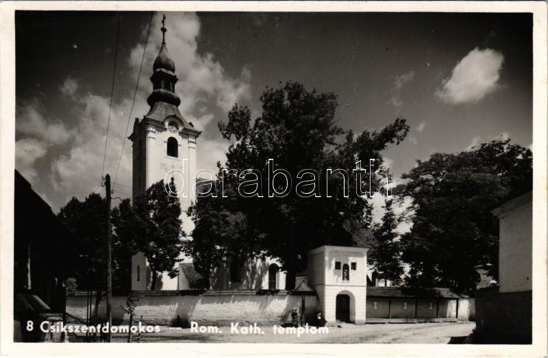 1943 Csíkszentdomokos, Sandominic; Római katolikus templom / church https://www.darabanth.com/hu/464-Gyorsarveres/464.0/Kepeslapok/Erdely~2000006/1943-Csikszentdomokos-Sandominic-Romai-katolikus-templom-church~II3125433