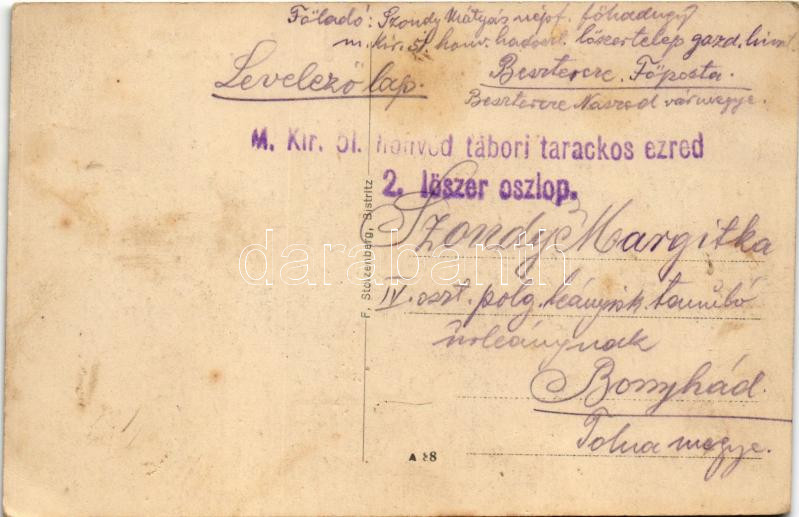 Leírás: Beszterce, Bistritz, Bistrita; Kórház utca. F. Stolzenberg kiadása / Spitalgasse / street + "M. Kir. 51. honvéd tábori tarackos ezred 2. lőszer oszlop" (fl)