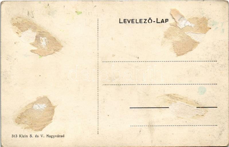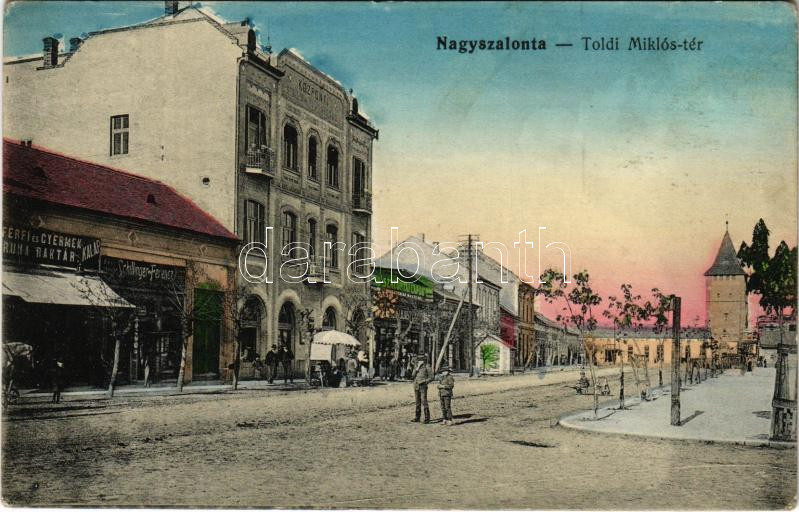 Nagyszalonta, Salonta; Toldi Miklós tér, Központi szálloda és vigadó, Szalontai Lapok politikai napilap, Edison Mozgó mozi, Schillinger Ferenc üzlete. Klein S. és V. kiadása / square, hotel, newspaper office, cinema, shop (ragasztónyomok / gluemarks)