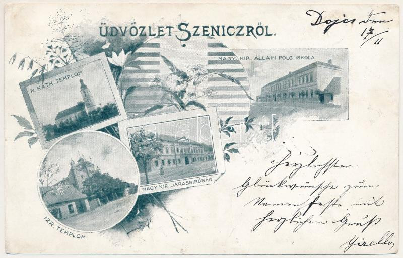 1900 Szenice, Szenicz, Senitz, Senica; Római katolikus és izraelita templom, zsinagóga, Magy. kir. járásbíróság, állami polgári iskola / church, synagogue, county court, school. Art Nouveau, floral (fl)