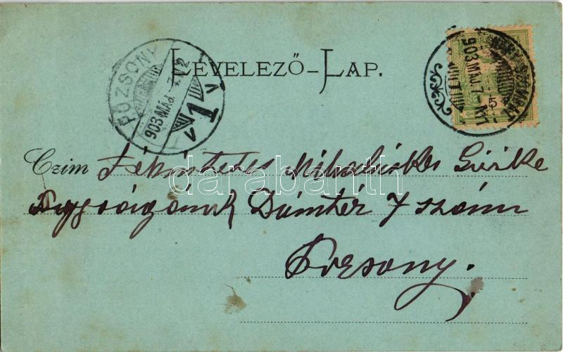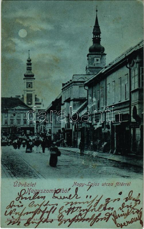 1903 Nagyszombat, Tyrnau, Trnava; Nagy Lajos utca, Fő tér, piac, üzletek. Horovitz Adolf kiadása / street view, main square, market, shops (felületi sérülés / surface damage)