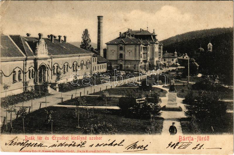1908 Bártfa, Bártfafürdő, Bardejovské Kúpele, Bardiov, Bardejov; Deák tér és Erzsébet királyné szálloda. Eschwig és Hajts kiadása. Hajts Kornél felvétele / spa, square, hotel (fa)