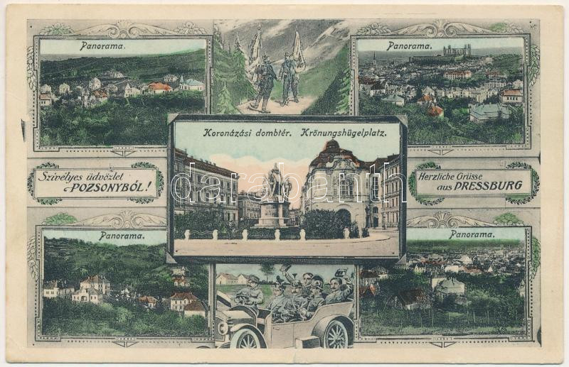 Leírás: 1917 Pozsony, Pressburg, Bratislava; Koronázási dombtér. Szecessziós katonai üdvözlet / Art Nouveau military greeting (kis szakadás / small tear)